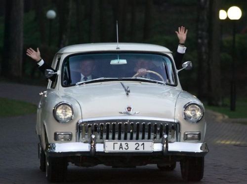 Bush driving Putin's classic 1956 Volga in Moscow in 2005. The car is a real beauty. As for the occupants, oh well.