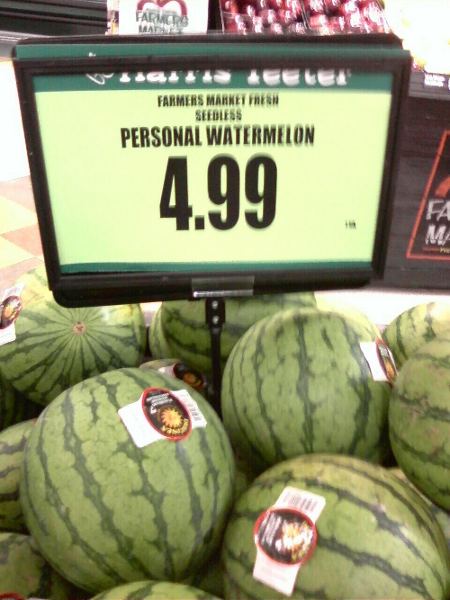 Here's a personal watermelon for ya. I whipped out the camera when I saw them in the supermarket tonight. It's hardly a meal, but every now and then we must eat some fruit, *gasp*. I didn't buy one though. Most supermarket fruit is reasonably nasty, especially in the off season. :down: Five bucks for that little thing? It must be the transportation cost, plus the lack of subsidy for anything that's not on the hoof.