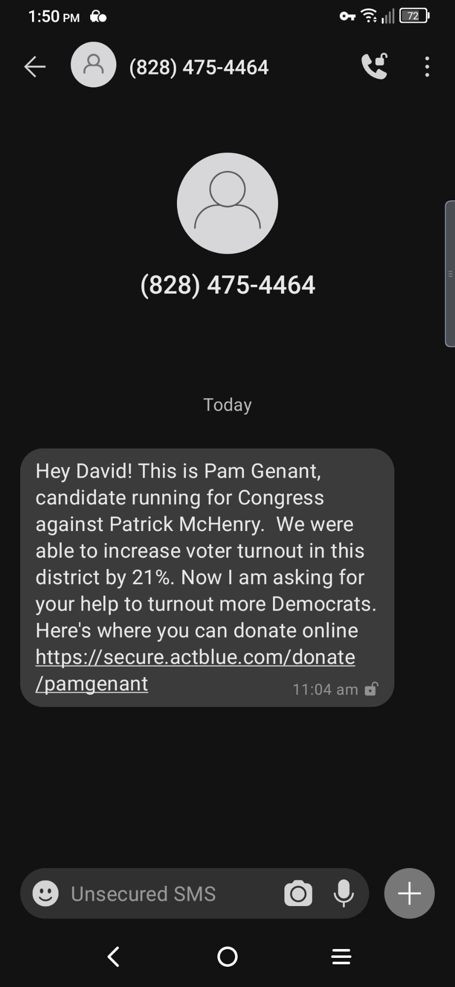 One of several screens of unsolicited texts. What activism. Sit on your ass and set your phone to automatically harass.